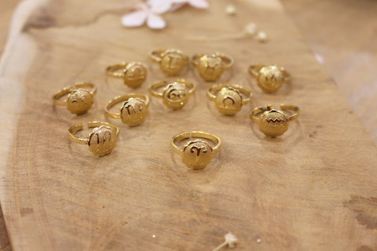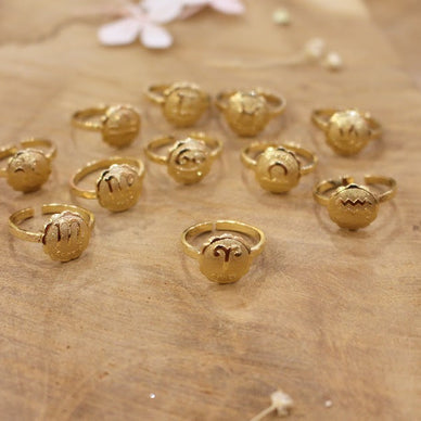 Bague réglable en laiton, dorée à l’or 24 carats 2 microns pour une excellente tenue de la dorure dans le temps. Le corps de bague est légèrement texturé et au centre a été soudée une pastille représentant chaque signe du zodiaque en relief