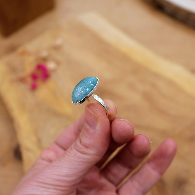 Ravissante bague argenté aux lignes classiques mettant en valeur une belle pierre d'amazonite avec sa couleur si douce et poétique ! Elle a été montée sur un corps de bague fin présentant de délicats motifs en relief. Une bague nous plongeant dans les mystères de la rêverie.