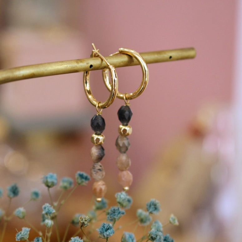 Les créoles sont en laiton doré à l'or 24 carats et ont été réalisées par nos soin dans notre atelier, et les pierres naturelles sont en pierre de lune pêche. Chaque perle est ainsi unique et présente de petites différences avec les autres, lui conférant ainsi un charme unique.