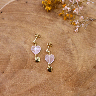 De belles pierres de quartz rose facettées taillées en forme de cœur auxquelles sont suspendus de jolis petits cœurs dorés et bombés, forment de jolies boucles d'oreilles pendantes dont la longueur est idéales, que vous ayez les cheveux longs ou une coupe plus courte.