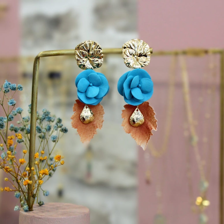 Grandes et belles boucles d'oreilles, créées à partir d'une estampe en laiton doré à l'or fin 24 carats. A cette estampe sont suspendus des éléments faits main, en forme de fleurs et de feuilles de couleur bleu vif et marron, en porcelaine à froid. Une goutte dorée apporte un éclat de lumière supplémentaire.