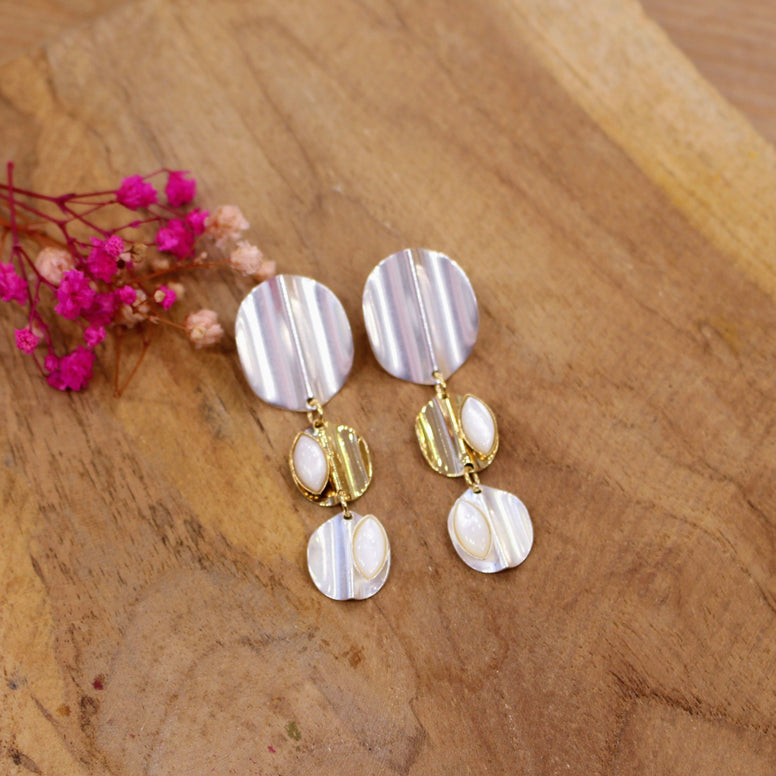 Les reflets dorés et argentés s’unissent en une danse vibrante, amplifiée par la douceur irisée des nacres blanches.