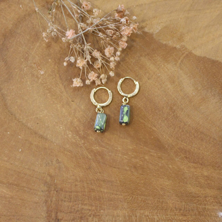 Cette paire toute en délicatesse se compose d'une petite créole sur laquelle est suspendu un tube en céramique brillant, de couleur verte. Chaque céramique étant unique, elle peut contenir quelques inclusions bleutées, ce qui lui confère une unicité. Un bijou qui apporte une touche de couleur et de gaieté !