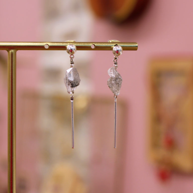 Les boucles Noctis associent la pureté minérale du diamant Herkimer à la brillance délicate du laiton recouvert d’argent 925.