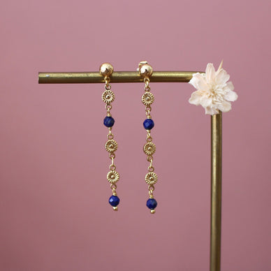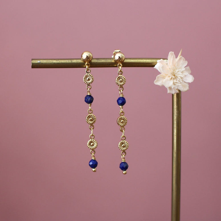 Petits motifs floraux alternés avec de petites perles 4 mm facettées en lapis-lazuli.