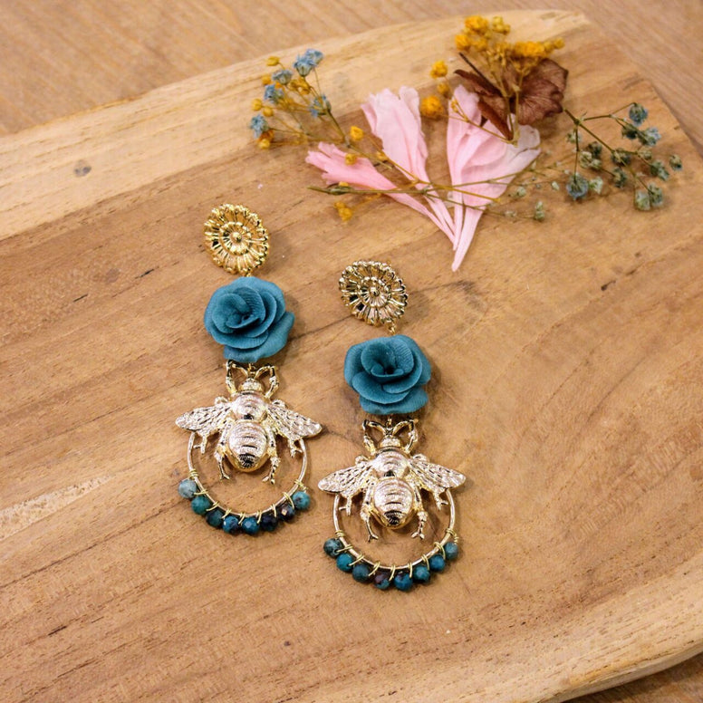 Le top est un beau tournesol venant habiller le lobe, sur lequel est suspendue une fleur couleur bleu canard, faite main en porcelaine froide, puis dessous se trouve une abeille reine étendant ses ailes sur un rond irrégulier sur lequel nous avons tissés des pierres de chrysocolle, une pierre ayant dans ses couleurs une dominante de bleu canard mais aussi quelques teintes aubergines et noires.