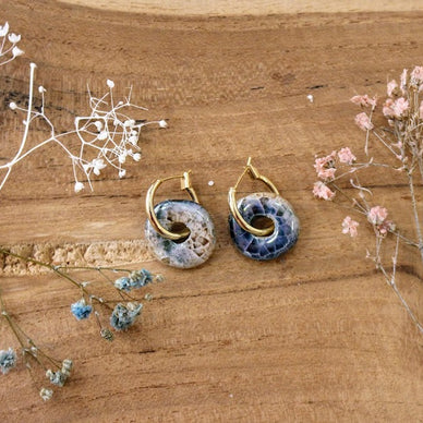Les créoles sont en laiton doré à l'or 24 carats et ont été réalisées par nos soin dans notre atelier, les disques en céramique ont également été tous réalisés à la main par des artisans partenaires en Grèce. Chaque disque est ainsi unique et présente de petites différences avec les autres, lui conférant ainsi un charme unique.