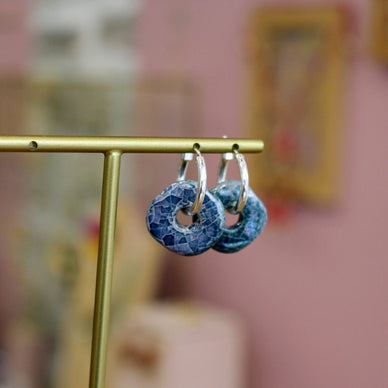 boucles d'oreilles créoles argentées disque amovible céramique émaillée bleu
