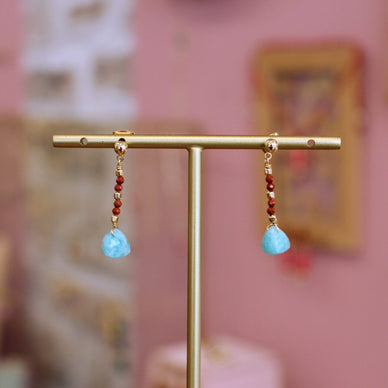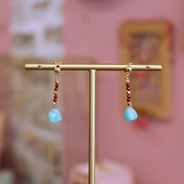 La pierre fine de jaspe rouge, rehaussée d’éclats turquoise et dorés, évoque le mystère et l’émerveillement des terres lointaines baignées de lumière.