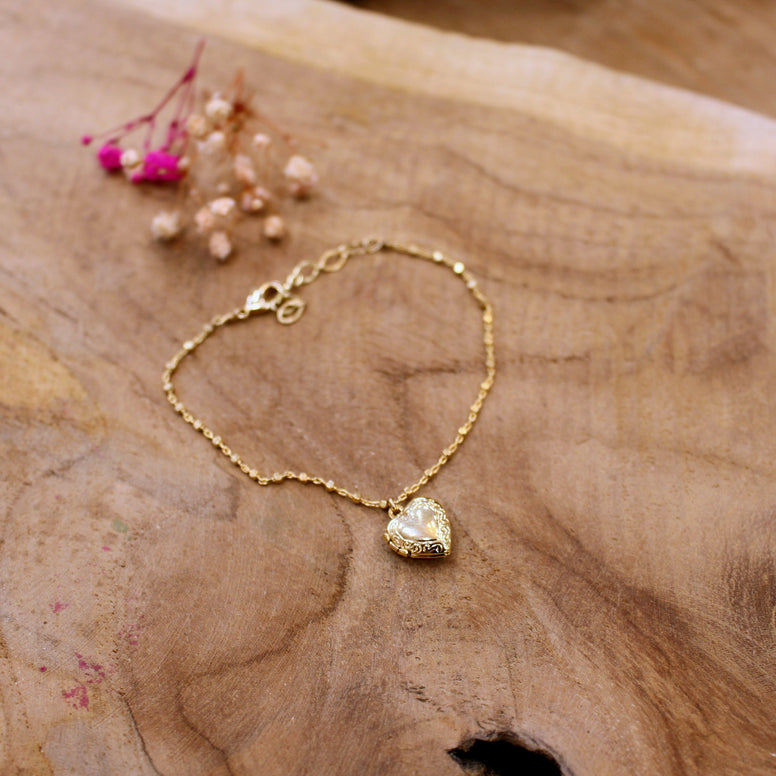 Délicat et lumineux, le bracelet Médaillon Cœur se compose d’une chaîne très fine qui se pose avec douceur autour du poignet. En son centre, un petit cœur d’environ 1 × 1 cm s’ouvre comme un écrin de mémoire, prêt à accueillir un mot, une date, un symbole ou une intention précieuse.