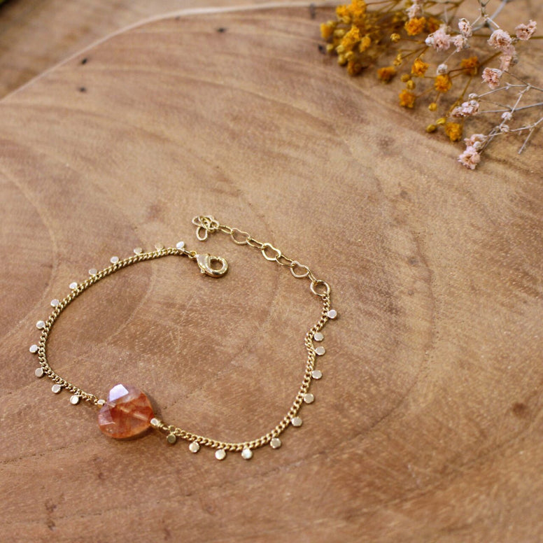 Bracelet mettant en valeur une belle pierre de quartz hématoïde avec ses belles couleurs chaleureuses rouge orangé, taillée en forme de cœur, montée sur une très jolie chaine de laiton doré 24 carats agrémentée de petites pastilles dorées. Un bijou plein de lumière et de chaleur.