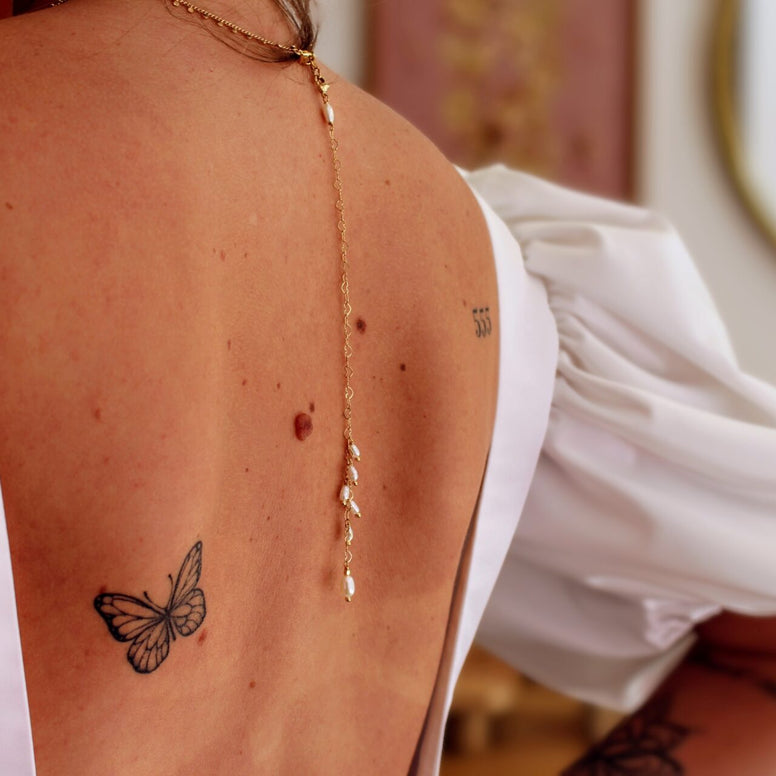 Imaginée pour les mariées en quête d’élégance discrète, cette chaîne de dos amovible se glisse au creux du dos. comme un souffle précieux. Elle s’attache à l’arrière de votre collier pour révéler une fine chute dorée, ponctuée d’une cascade de perles d’eau douce. Une création pensée pour sublimer les robes échancrées et ajouter ce détail qui change tout : un bijou aussi délicat qu’inoubliable.