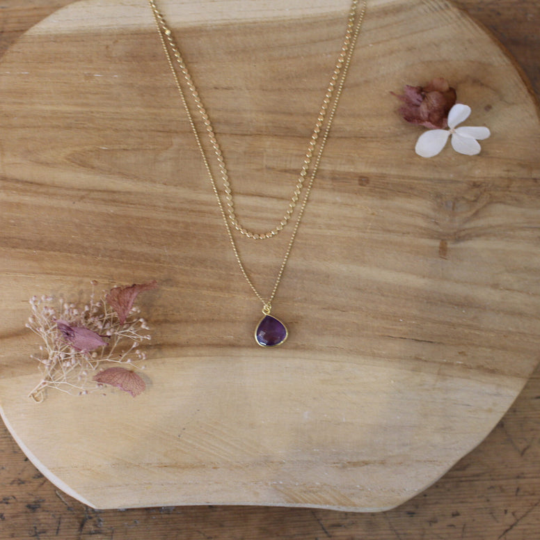 le premier rang ras du cou est a été confectionné avec une chaine aux maillons plats. Dessous se trouve une chaine fine plus longue dont la finition est diamantée. Y est suspendu un pendentif en forme de goutte qui est réalisé à partir d'une pierre en améthyste facettée et sertie.