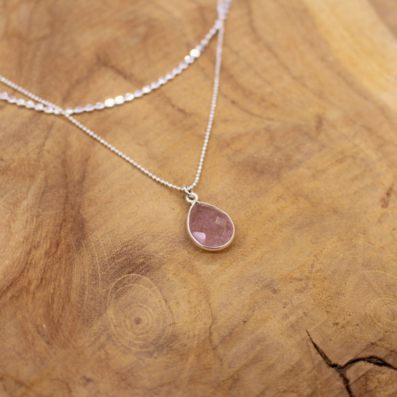 Ce collier argenté, orné d’un quartz fraise délicatement rosé, reflète la tendresse du cœur et la joie de créer à partir de soi.