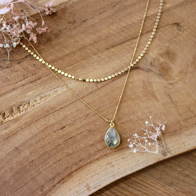 Élégant et intemporel, ce collier double rang unit une fine chaîne diamantée et la douceur verte d’une goutte de préhnite épidote, pierre connue pour inviter à l’ancrage et à la clarté intérieure. Il s’accorde facilement au quotidien, qu’il soit porté sur un pull, un chemisier ou une robe, et habille la silhouette d’une lumière apaisante.
