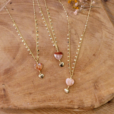 Une jolie pierre de quartz hématoïde facettée comme pendentif sous lequel est suspendu un plus petit cœur doré, le tout monté sur un duo de chaine fine et comportant quelques maillons plats apportant éclat et lumière tout en restant discret et facile à porter au quotidien.
