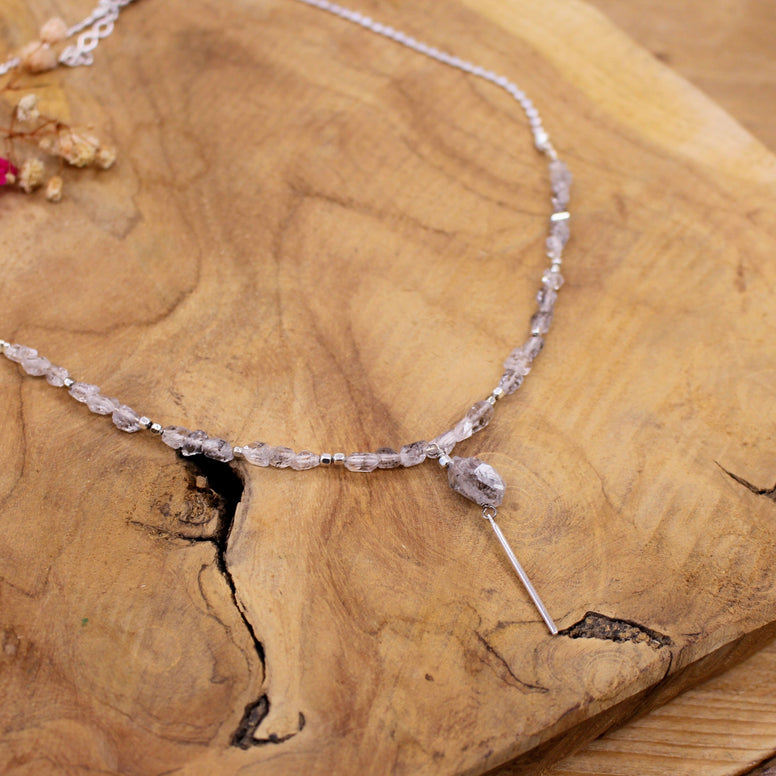 Un bijou pensé comme une sculpture discrète, où chaque facette du diamant Herkimer dialogue avec la douceur argentée du métal.