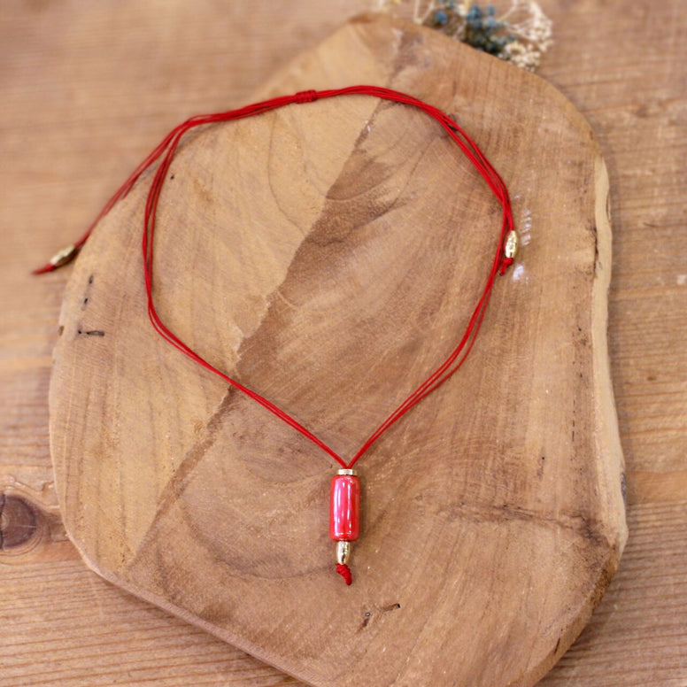 Ce collier au design minimaliste est composé d’un pendentif en céramique émaillée rouge, monté sur un cordon ajustable. Sa couleur vive apporte une touche d’énergie à vos tenues, tout en restant facile à associer. Le bijou se porte aussi bien long que court, grâce à son système de nœuds coulissants. Deux perles dorées apportent une finition délicate, à porter dans la nuque ou à l’avant selon votre style.